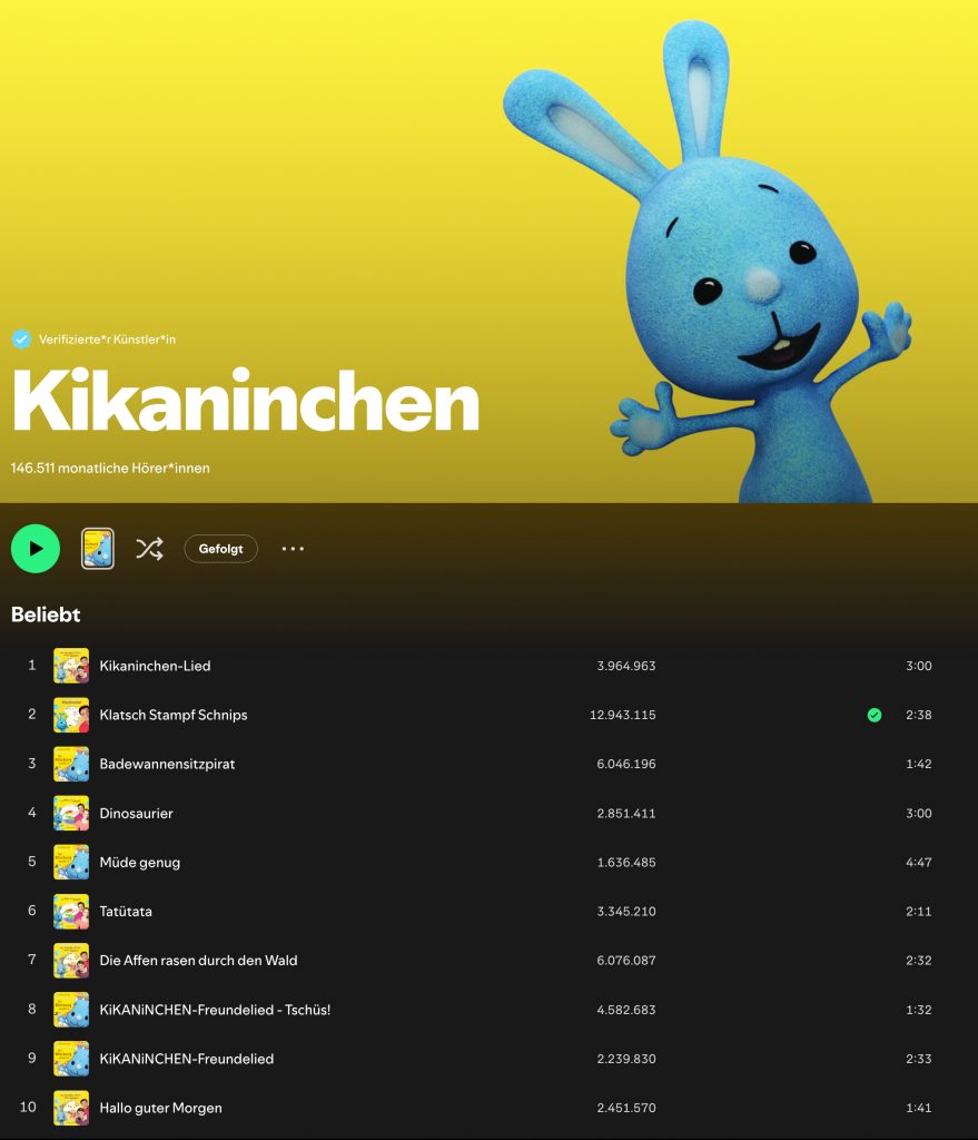 Die TOP 10 der KIKANINCHEN-Songs haben über 46 Millionen Streams bei SPOTIFY:
